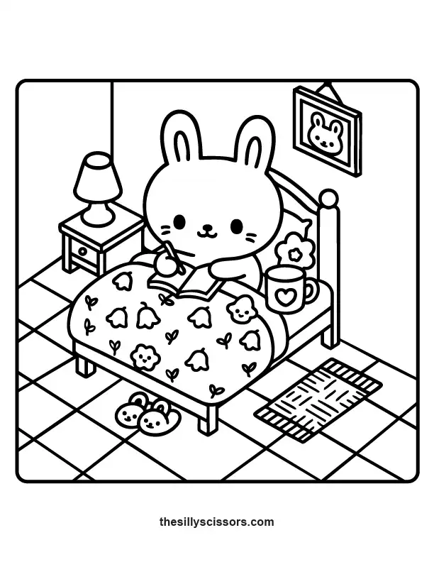 This peaceful bedroom scene features a sweet bunny tucked into a patterned blanket, surrounded by soft lighting and charming room details. A calm and comforting page perfect for slow, relaxing coloring moments.