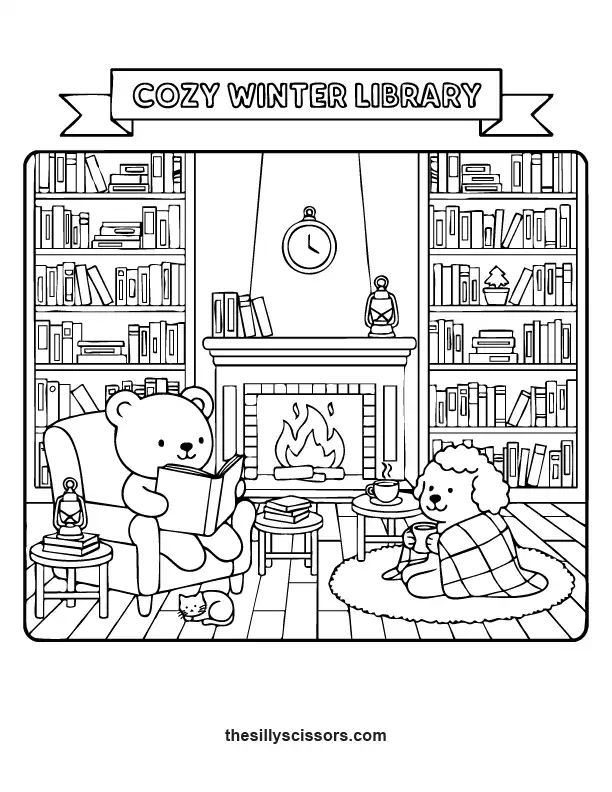 A warm fireplace glows as bear and dog enjoy a quiet reading moment inside a book-filled winter library. Perfect for soft warm tones and textured shading.