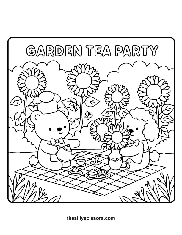 Bear and dog enjoy a charming tea party outdoors surrounded by oversized sunflowers and soft garden details. A delightful scene for floral palettes and gentle shading.