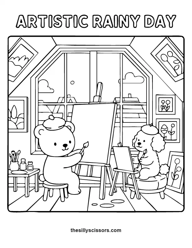 This cozy attic art studio shows bear and dog painting together while rain falls outside the window. A relaxing indoor scene full of creative atmosphere.