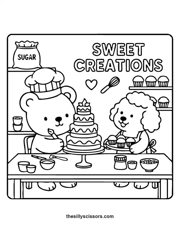 A warm bakery scene where bear and dog decorate a tall layered cake surrounded by cupcakes and kitchen details. Ideal for adding soft pastel tones or bold dessert colors.