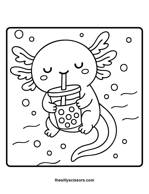 This content axolotl floats peacefully underwater, savoring a delicious bubble tea. A charming coloring page for kids and bubble tea lovers who enjoy cute aquatic characters.
