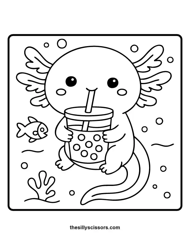 This happy axolotl sips on a tasty bubble tea while a curious fish swims nearby. A playful coloring page for kids and anyone who enjoys cute underwater adventures.