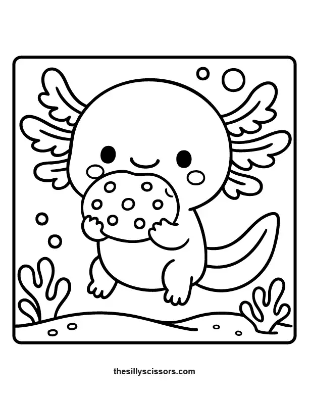 This cute axolotl enjoys a big cookie while relaxing underwater among plants and bubbles. A fun coloring page for kids and anyone who loves adorable sea creatures and sweet treats.