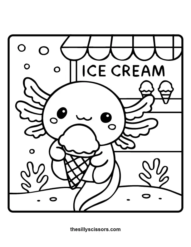 This happy axolotl holds a big ice cream cone in front of a seaside shop. A sweet and cheerful coloring page for kids and dessert lovers who enjoy cute underwater characters.