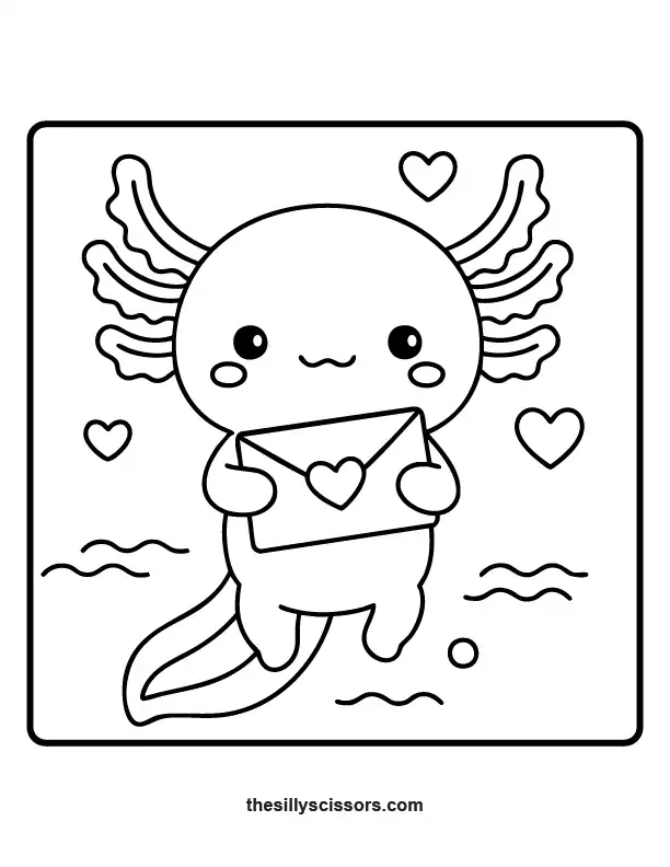 This adorable axolotl floats happily underwater, holding a sweet love letter surrounded by hearts. A perfect coloring page for Valentine’s Day or anyone who enjoys heartwarming ocean scenes.