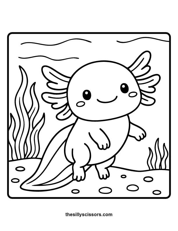 A happy axolotl pauses on the sandy seabed, framed by swaying plants and gentle bubbles. A perfect coloring page for ocean lovers and fans of adorable underwater scenes