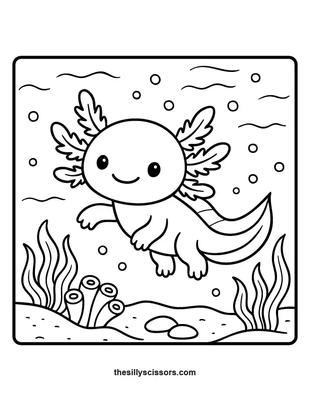 This cheerful axolotl glides gracefully through the water, surrounded by plants and bubbles. A relaxing coloring page for kids and anyone who enjoys peaceful ocean scenes.