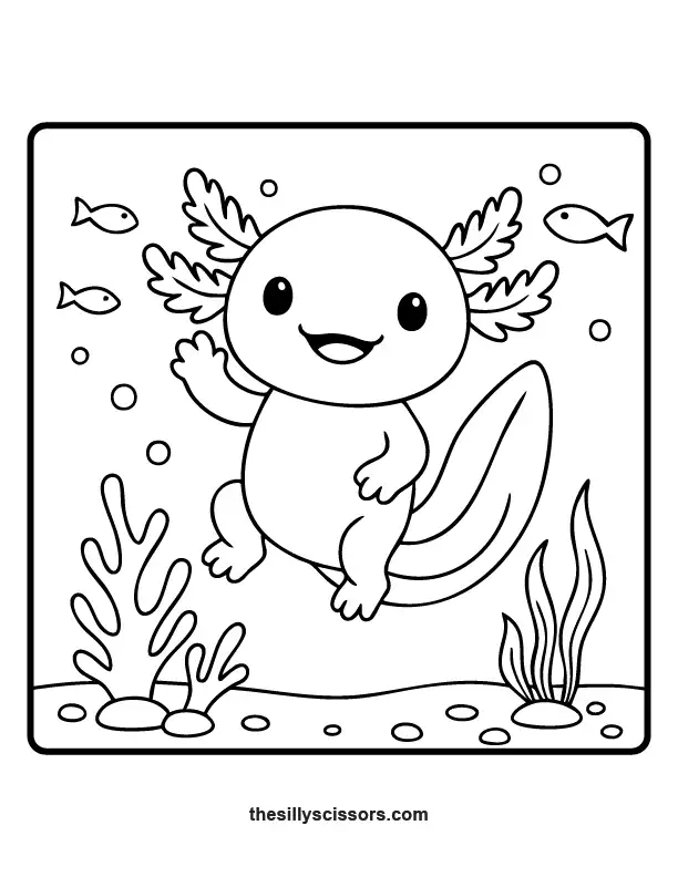 This cheerful axolotl greets friendly fish as they swim by in a lively underwater scene. A charming coloring page for kids and ocean lovers who enjoy cute aquatic animals.