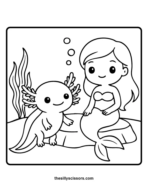 A friendly axolotl meets a smiling mermaid in this enchanting underwater scene. Perfect for kids and ocean lovers who enjoy magical sea creature coloring pages.