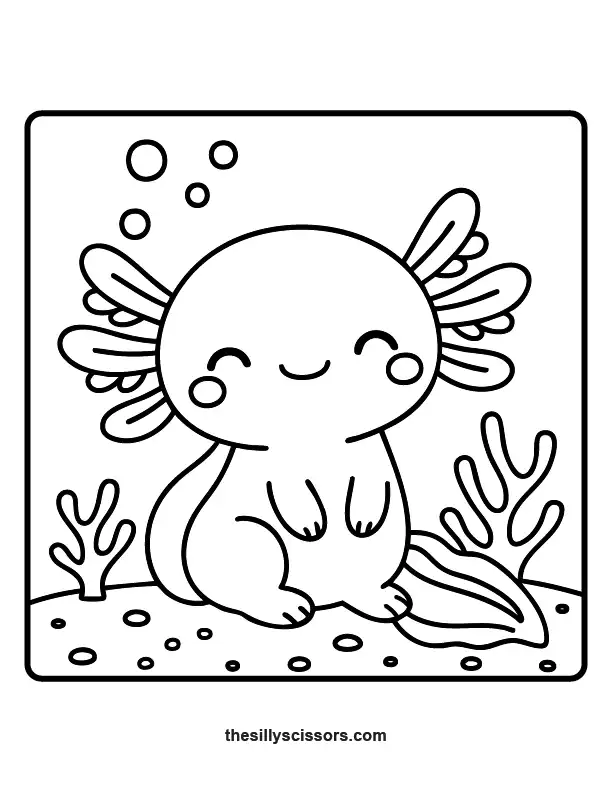 This adorable axolotl sits happily among gentle plants and bubbles. A sweet and calming coloring page for kids or anyone who loves cute underwater creatures.