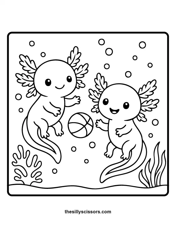 These cheerful axolotls splash around underwater, tossing a ball between them. A delightful coloring page for kids and adults who enjoy fun ocean scenes with adorable aquatic friends.
